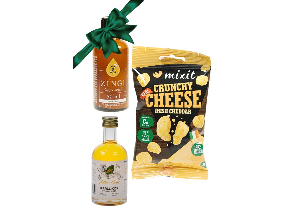 V balíčku se spojuje svěží přírodní shot ZINGI, který povzbudí a osvěží, dále ručně vyráběný bylinný likér KARLLIKÖR a křupavý cheddarový snack z pravého irského sýra. Balíček potěší gurmány, milovníky kvalitních specialit i ty, kteří si rádi dopřejí něco nového a výjimečného.