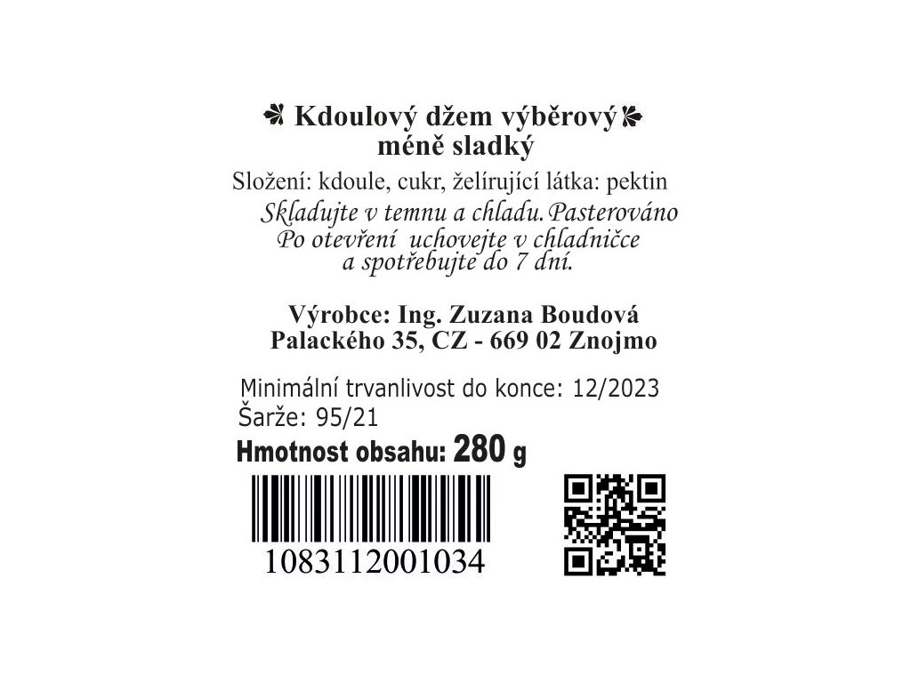 Výběrový džem z kdoulí je tradiční delikatesa s výraznou vůní a jemně nakyslou chutí. Skvěle se hodí k tvrdým sýrům, paštikám, na čerstvé pečivo nebo jako gurmánský doplněk do dezertů. Vyroben s vysokým obsahem ovoce a bez zbytečných aditiv.