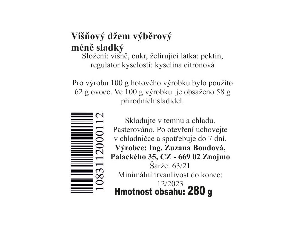 Složení: višně, cukr, želírující látka: pektin, regulátor kyselosti: kyselina citronová