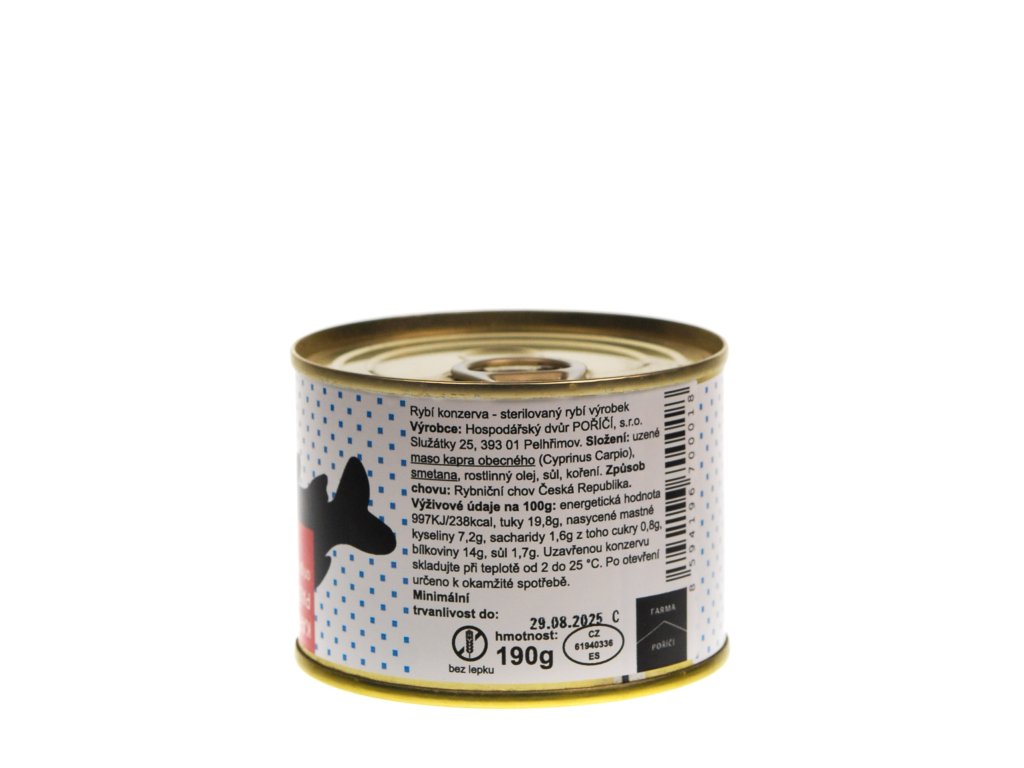 Složení: uzené maso kapra obecného (Cyprinus Carpio), smetana, rostlinný olej, sůl, koření.