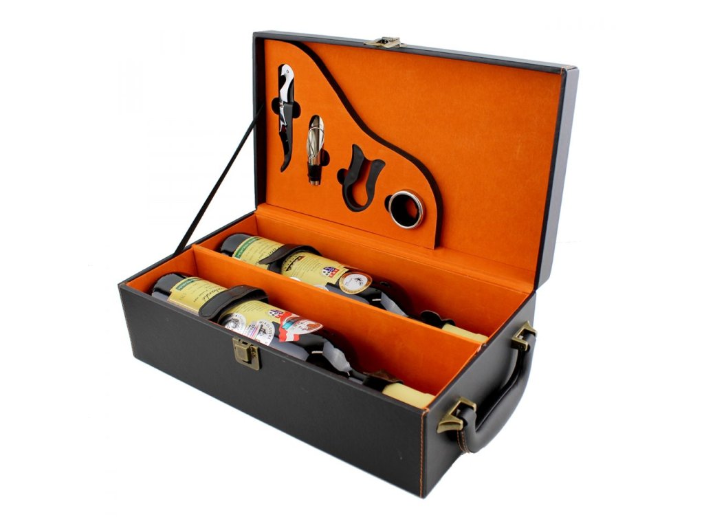 Dárková kazeta na dvě láhve vína se sommelierskými doplňky.