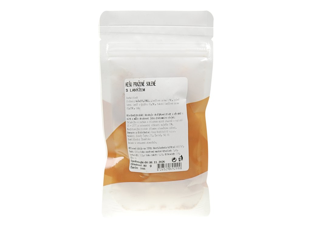 Složení: kešu (97,78 %), lanýžové aroma (2 %), sušený letní lanýž v prášku (0,2 %), tekuté lanýžové aroma (0,02 %), cukr
