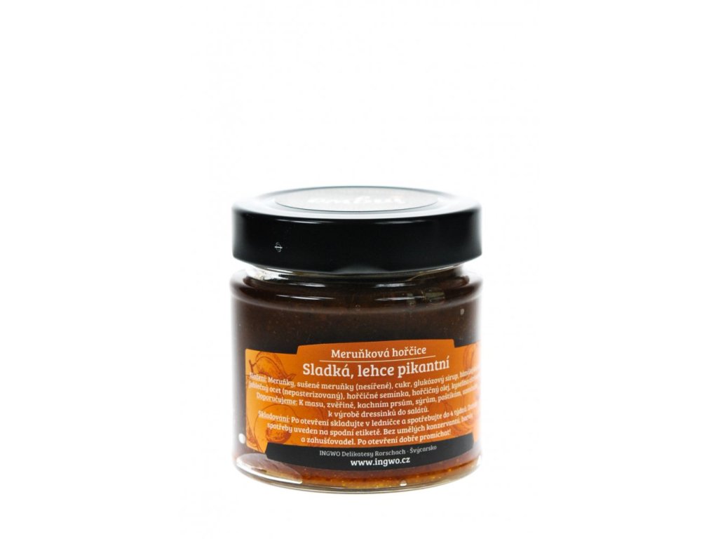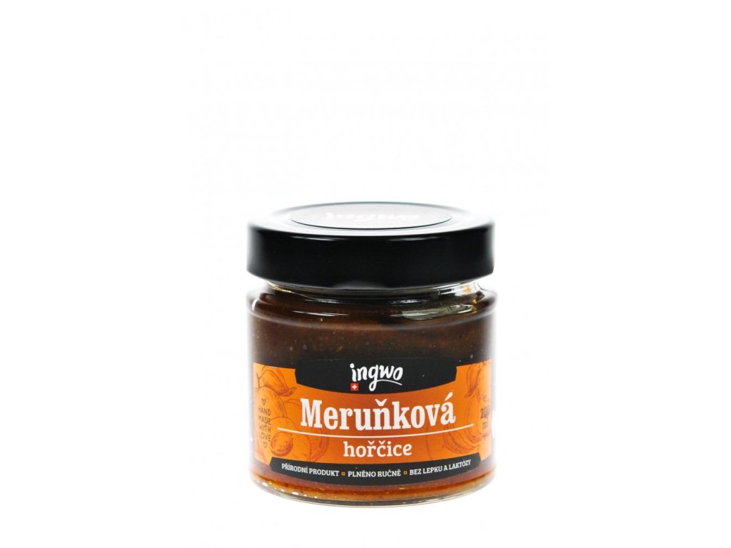 Meruňková hořčice je delikatesní kombinací sladkých meruněk a pikantních hořčičných semínek. Skvěle doplní grilované maso, zvěřinu, kachní prsa, sýry, paštiky nebo salátové dresinky. Přírodní produkt bez konzervantů, barviv a zahušťovadel, plněný ručně a vhodný pro bezlepkovou i bezlaktózovou dietu.