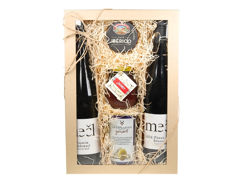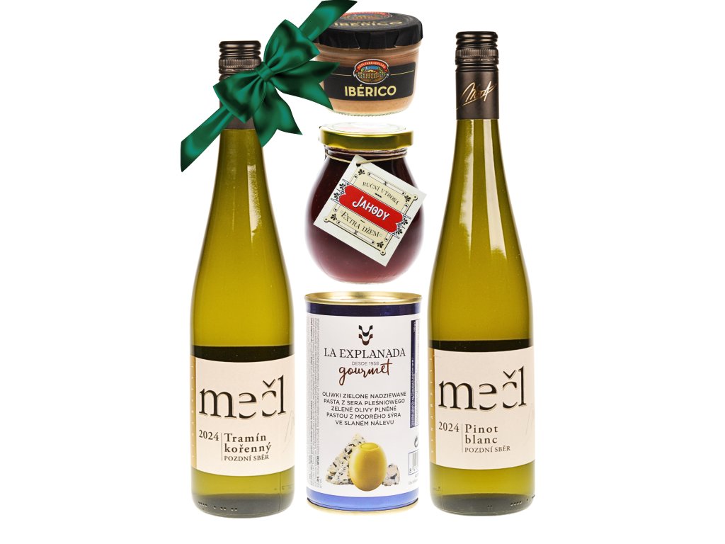 se skvěle hodí k večernímu posezení, k ochutnávce vín nebo jako malý gurmánský zážitek. Kombinace oliv plněných modrým sýrem, jemné vepřové paštiky Ibérico, domácího jahodového džemu a lahvových vín Mečl tvoří velmi vyvážený balíček, který potěší každého, kdo má rád kvalitní regionální produkty.