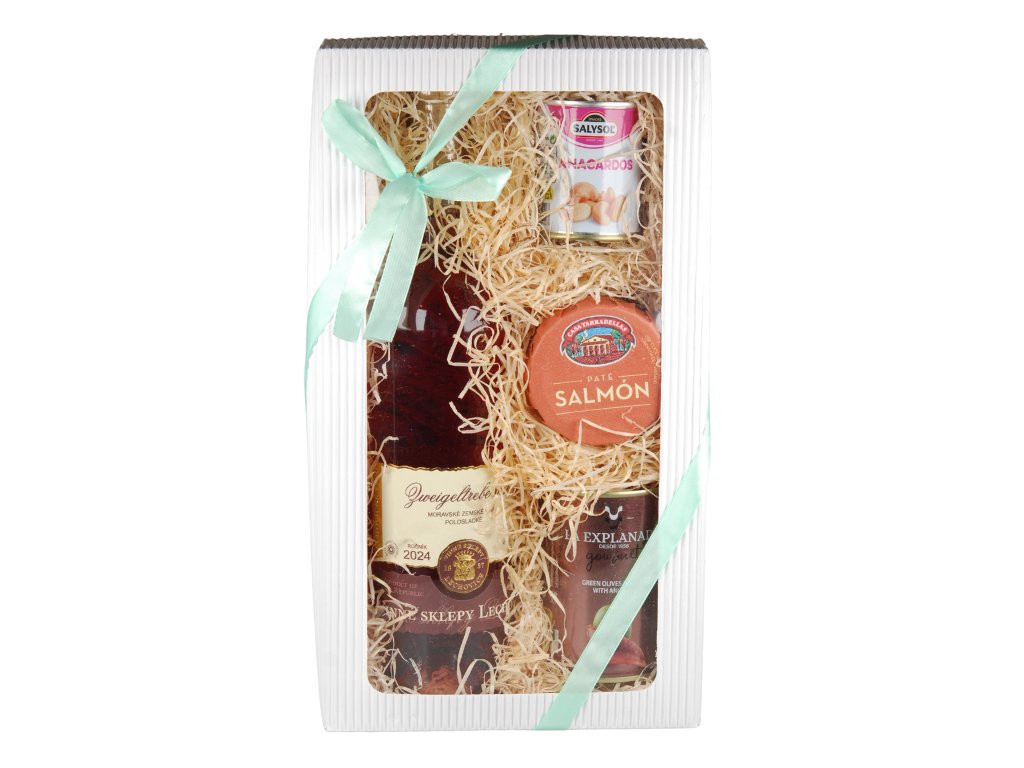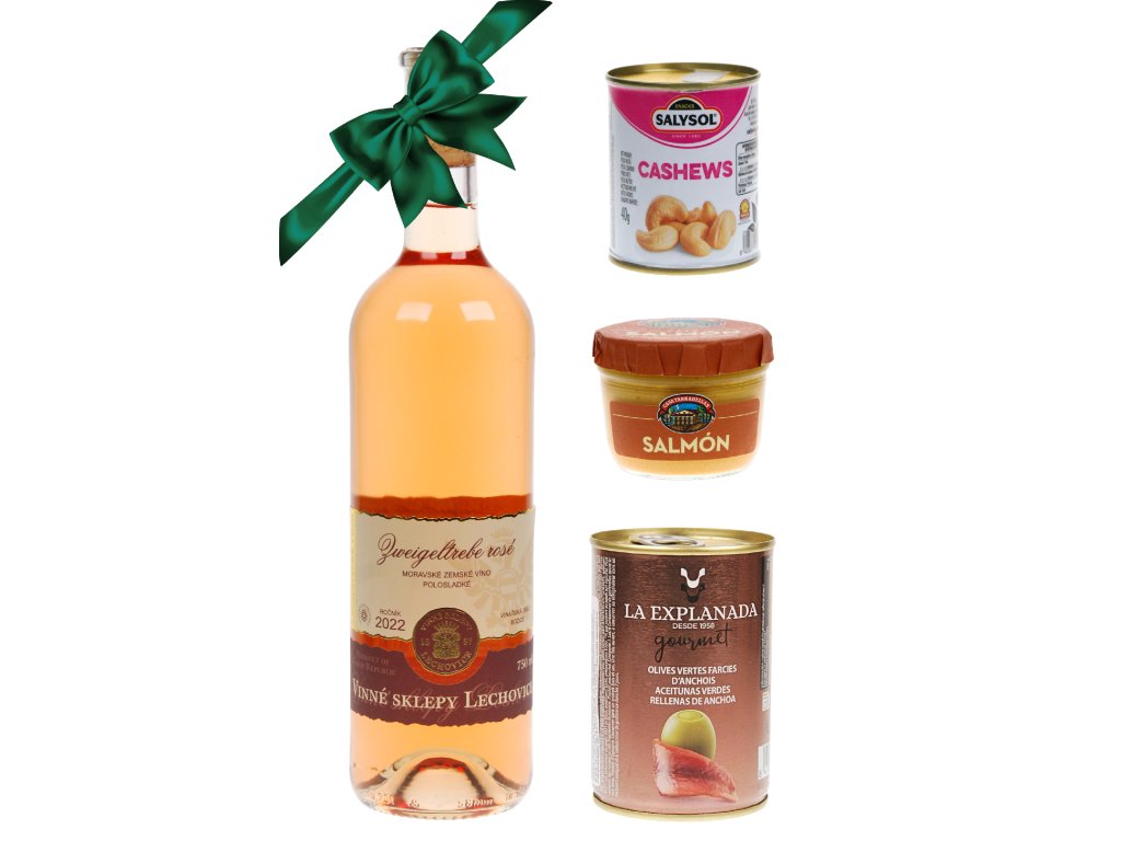 Dárkový balíček obsahuje Rosé Zweigeltrebe, moravské zemské, polosladké víno, 2024 – Vinné sklepy Lechovice, Kešu pražené v plechovce 40 g SALYSOL, Paštiku s lososem 125 g a Olivy plněné ančovičkou 120 g.