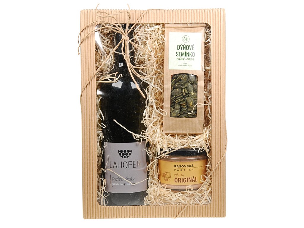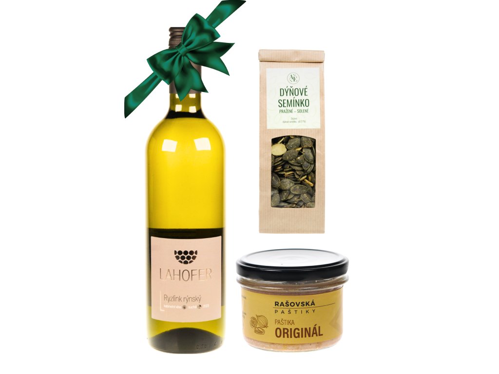 V balíčku najdete svěží suché bílé víno Ryzlink rýnský od vinařství Lahofer s vůní zralých meruněk a lipového medu, k tomu jemnou vepřovo-játrovou paštiku z rodinné konzervárny Rašovská bez lepku a bez konzervantů a pražená solená dýňová semínka ze Znojemska, ideální ke křupnutí k vínu nebo jen tak k posezení. Celý balíček je laděný jako pohodový večerní snack set – víno, paštika, pečivo a semínka, stačí už jen otevřít a užít si společné chvíle.