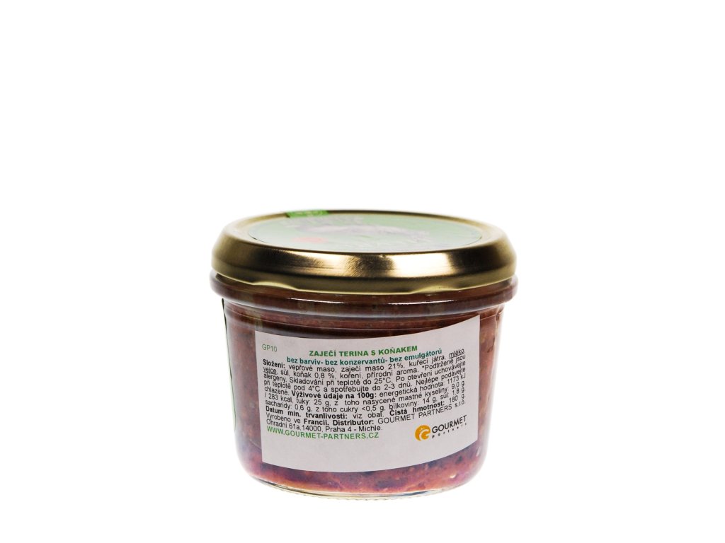 Složení: vepřové maso, zaječí maso (21 %), kuřecí játra, mléko, vejce, sůl, koňak (0,8 %), koření, přírodní aroma.