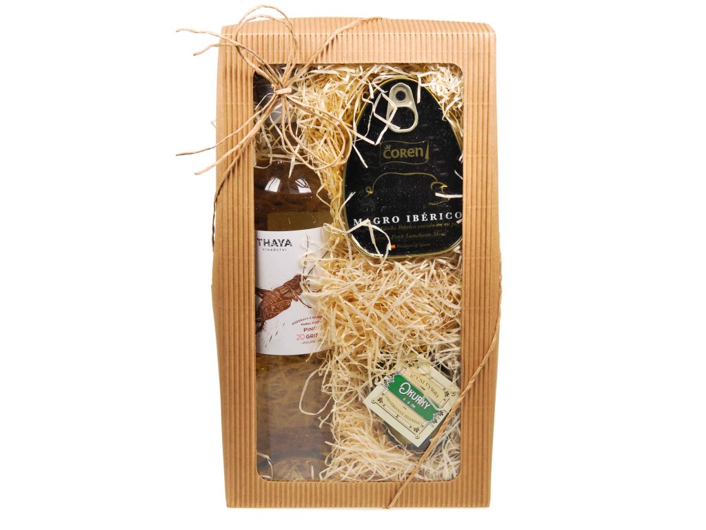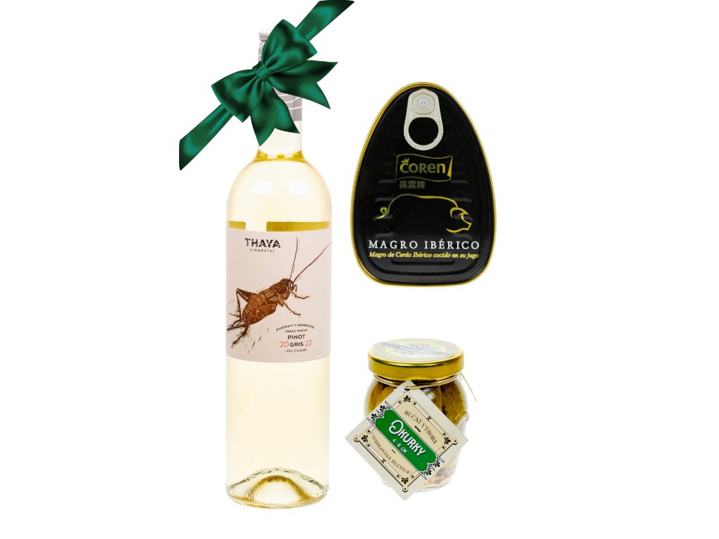 Dárkový balíček – víno, šunčička a okureček. Stačí jen koupit pečivo :) je vtipně a zároveň prakticky poskládaný balíček, který se hodí jako dárek pro gurmány i milovníky moravských vín. Ideální je jako dárkový balíček pro muže, ale potěší i ženu, která si ráda pochutná na kvalitních a poctivých regionálních dobrotách. Využijete ho jako dárek k narozeninám, k poděkování nebo třeba jako pozornost pro kolegu. Kombinace lahodného vína, výběrové šunky z iberského prasátka a znojemských okurek je neodolatelná a už stačí jen čerstvý chleba.