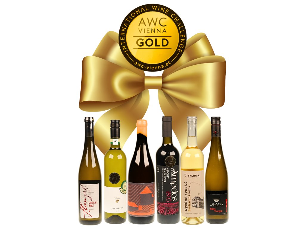 Vína vybraná do kartonu - Tramín červený, zemské, suché víno, 2022 – Nešetřil, alk. 13,5 %, zbytkový cukr neuvedeno, obsah kyselin neuvedeno, objem láhve 0,75 l; Muškát žlutý, pozdní sběr, polosladké víno, 2023 – Hanzel, alk. 11,0 %, zbytkový cukr 38,20 g/l, obsah kyselin 7,14 g/l, objem láhve 0,75 l; Müller Thurgau, výběr z bobulí, sladké víno, 2023 – Lahofer, alk. 10,5 %, zbytkový cukr 77,49 g/l, obsah kyselin 7,09 g/l, objem láhve 0,75 l; Sauvignon, VOC, polosuché víno, 2023 – Piálek a Jäger, alk. 12,0 %, zbytkový cukr neuvedeno, obsah kyselin neuvedeno, objem láhve 0,75 l; Ryzlink rýnský, pozdní sběr, polosuché víno, 2022 – Znovín, alk. 12,5 %, zbytkový cukr 16,60 g/l, obsah kyselin 7,00 g/l, objem láhve 0,75 l; Neronet Blauburger, zemské, suché víno, 2022 – Ampelos, alk. 13,0 %, zbytkový cukr 0,50 g/l, obsah kyselin 5,50 g/l, objem láhve 0,75 l.